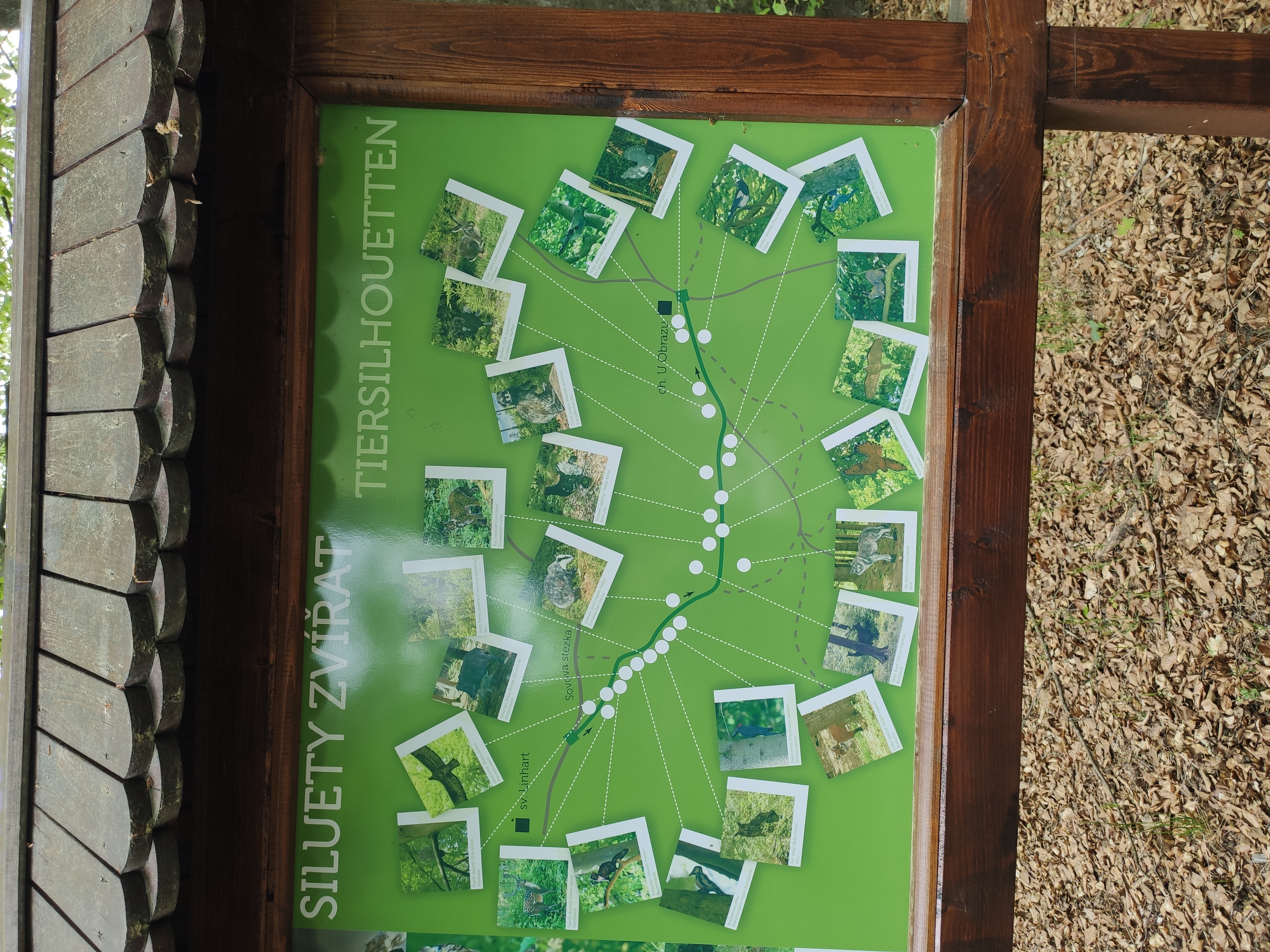Po okruhu v oboře jsme se vydali na stezku SILUETY ZVÍŘAT. Na začátku jsme skoro žádné nemohli najít, přešli jsme snad 5 zvířat :-) Proto doporučuji na začátku vyfotit si mapu této stezky a ta vás navede kde hledat. Poté jsme také tak učinili a nakonec všechna zvířata našli. Hledejte i nad sebou- ptáci jsou na laně mezi stromy. To byl pro nás oříšek. Na trase si dvojčata chtěla dát svačinku, a tak jsme rozložili piknikovou deku u jedné ze siluet..zajíčka. Pozor z mapy se zdá, že stezka siluet zvířat je dlouhá-není tomu tak! Stezka měří něco málo přes 1km.